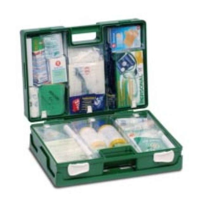 Contenitore realizzato in ABS, con supporto a parete, composto da due parti uguali ciascuna completa di vetri e separatori per un migliore alloggiamento dei prodotti. Dotata di supporto per attacco a parete. Chiusura con due clip rotanti. Tenuta ermetica garantita da una guarnizione in neoprene. Indicato per rischi specifici: industrie chimiche, meccaniche, del legno, edilizia e aziende agricole. Disponibile anche in versione armadietto pensile. Contenuto: 1 Copia Decreto Min 388 del 15.07.03; 5 Paia guanti sterili; 1 Mascherina con visiera paraschizzi; 3 soluzione fisiologica sterile 500 ml CE; 2 Flaconi disinfettante 500 ml IODOPOVIDONE al 10% iodio PMC; 10 Buste garza compressa sterile 10×10 cm; 2 Buste garza compressa sterile 18×40 cm; 2 Teli sterili 40×60 cm DIN 13152-BR; 1 Confezione di cotone idrofilo; 2 Pinze sterili; 1 Astuccio benda tubolare elastica; 2 Rocchetti cerotto adesivo m 5×2,5 cm 2 PLASTOSAN 20 cerotti assortiti; 1 Paio di forbici tagliabendaggi cm 14,5 DIN; 3 Lacci emostatici; 2 ICE PACK ghiaccio istantaneo; 2 Sacchetti per rifiuti sanitari; 1 Termometro clinico digitale; 1 Sfigmomanometro PERSONAL con fonendoscopio; 2 Benda m 3,5×10 cm orlata; 1 Astuccio contenente: 3 sapone liquido, 3 salviette disinfettanti, 2 salviette ammoniaca; 1 Coperta Isotermica oro/arg. 160×210 cm; 1 Telo triangolare TNT 96x96x136 cm; 1 apribocca PINOCCHIO + rianimatori VENTO; 2 bustine monouso gel scottature; 2 Benda elastica m 4×6 cm; 1 Tampobenda sterile mm 80×100 DIN 13151; 1 Istruzioni MULTILINGUA pronto soccorso.